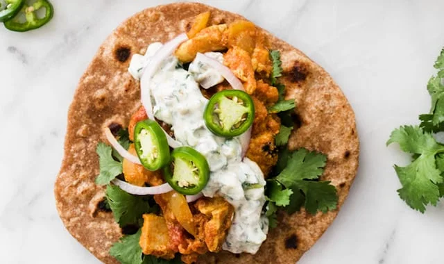 Indulge in a burst of bold flavors with our Chicken Masala Taco! Juicy, spiced chicken wrapped in a soft taco shell, topped with fresh veggies and a zesty sauce for the perfect bite. A delicious fusion of Indian spices and Mexican flair!